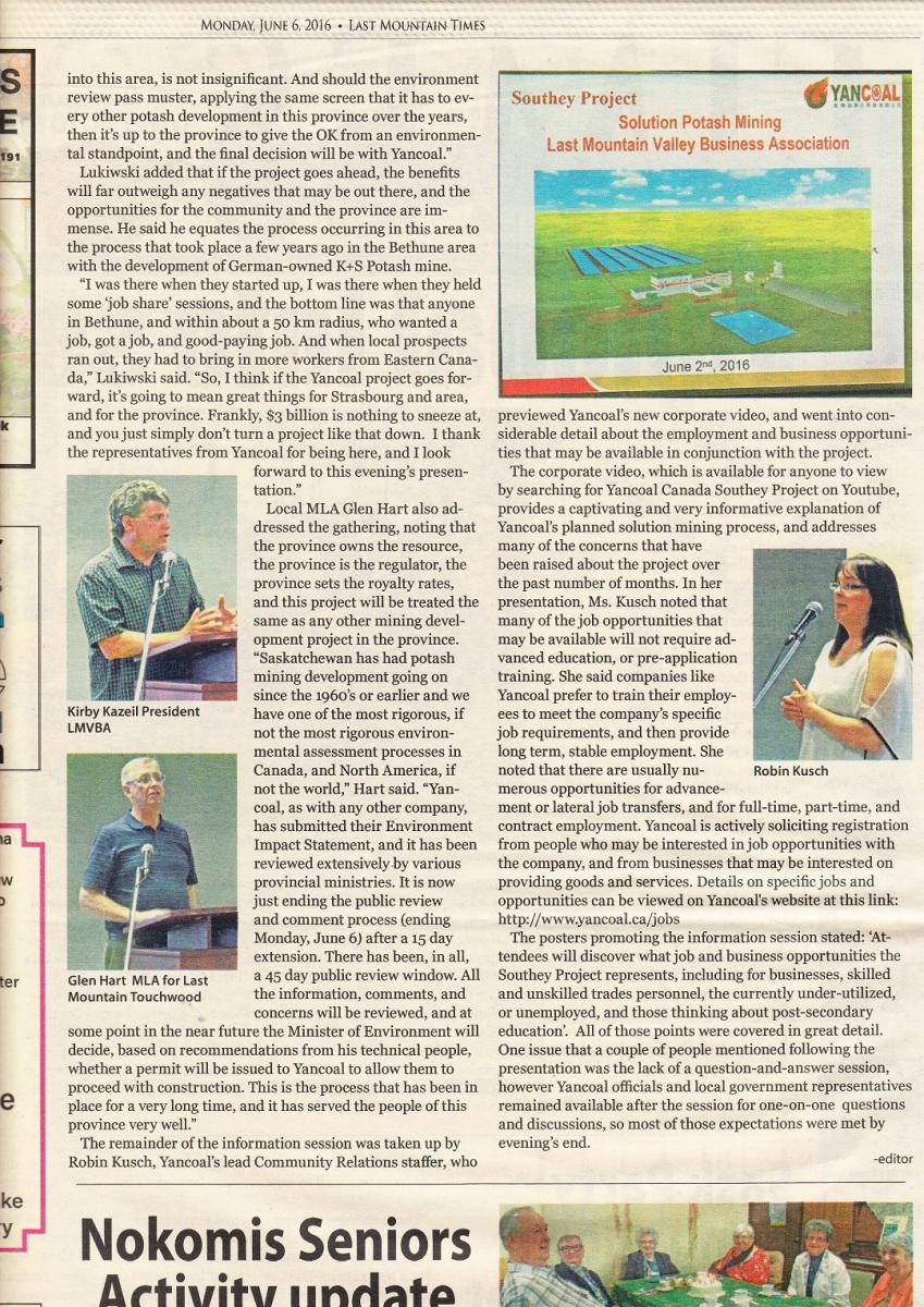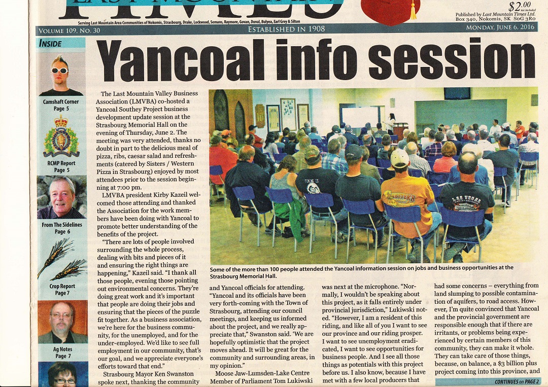The following is a copy of the report on Yancoal Canada's June 2, 2016 information session with the Last Mountain Valley Business Association (LMBVA) from the Last Mountain Times.